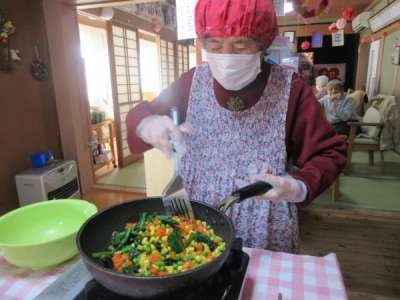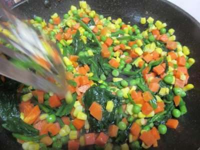 ほうれん草とミックスベジタブルをフライパンで炒めて