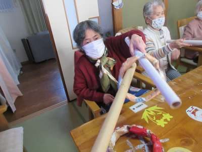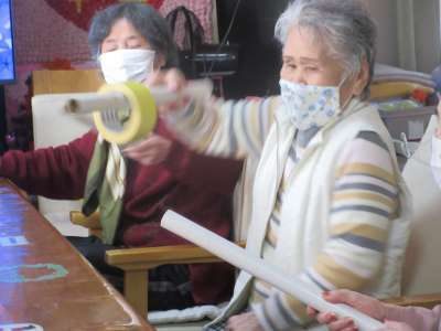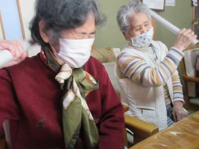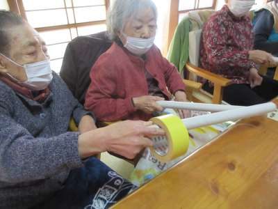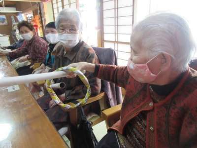 最後は、棒を使って、隣の方からのリングの受け渡しを