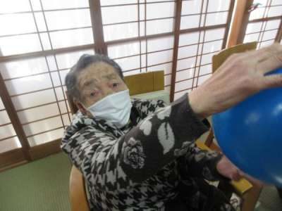 風船を受けるべく、両手を出して構えている幸せの幸望庵