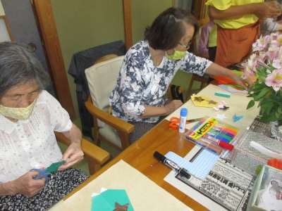 完成した記念に、七夕飾りを持って写真撮影しましたカメラ