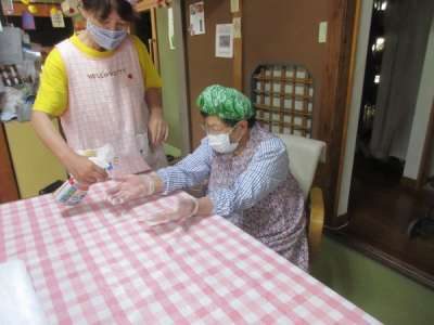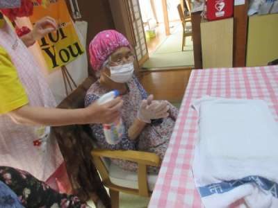 エプロン、三角頭巾、ゴム手袋を着用後、こうして