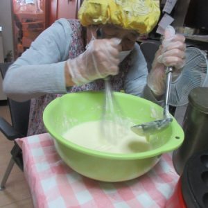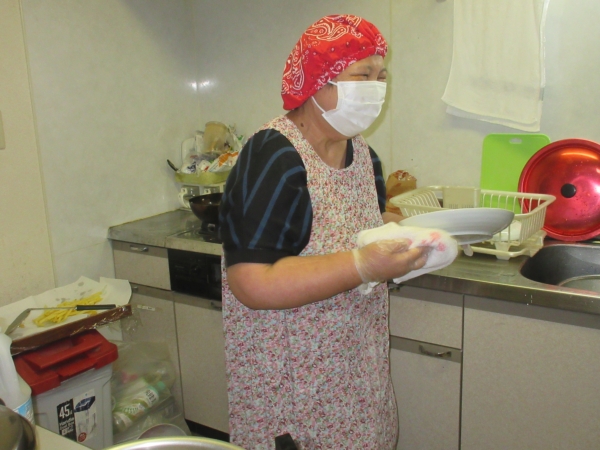 エプロン、三角頭巾、ゴム手袋を着用した後、アルコール消毒を済ませてから、