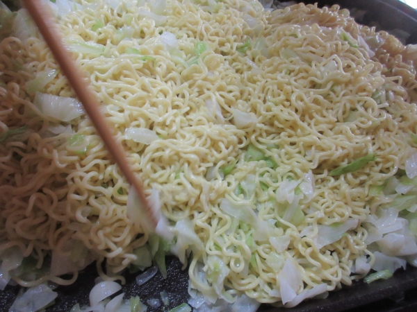 焼きそばソースをかけて、しっかりと混ぜれば出来上がり目がハート (顔)
