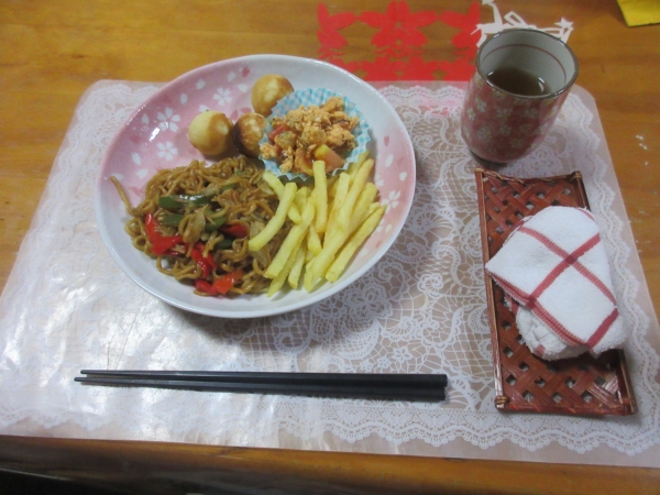 レストランワンプレートランチ(やきそば、フライドポテト、トマ卵、ベビーカステラ)