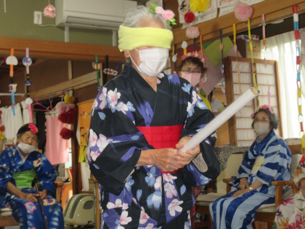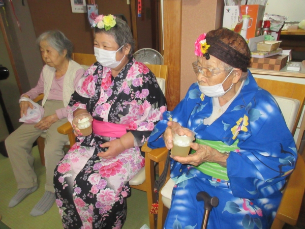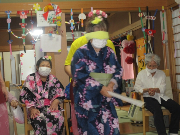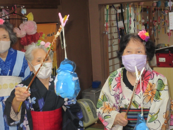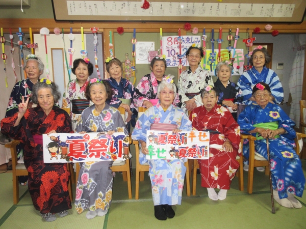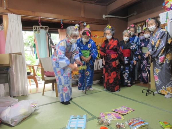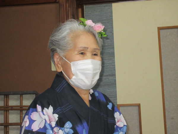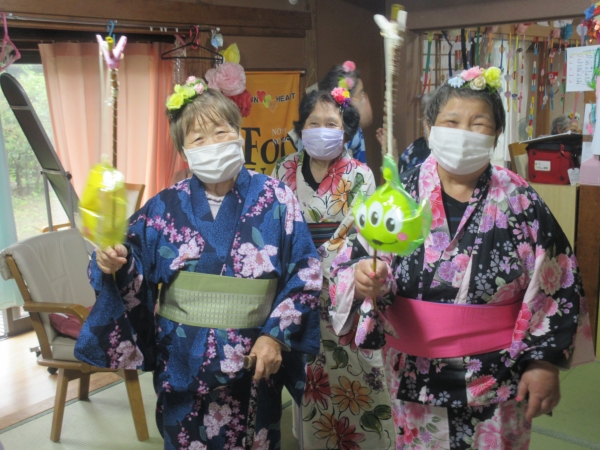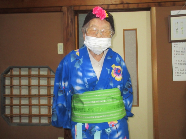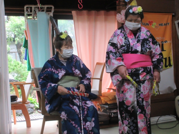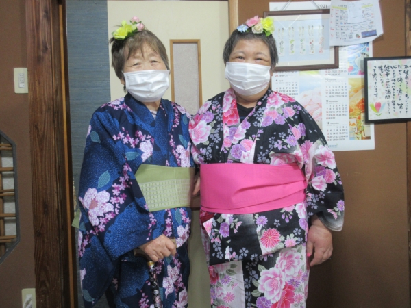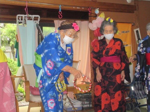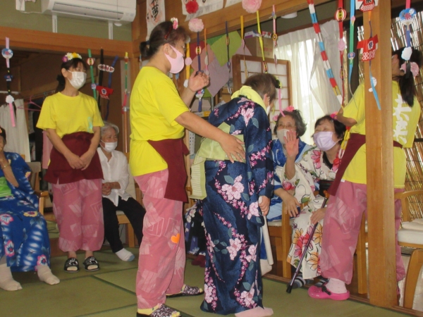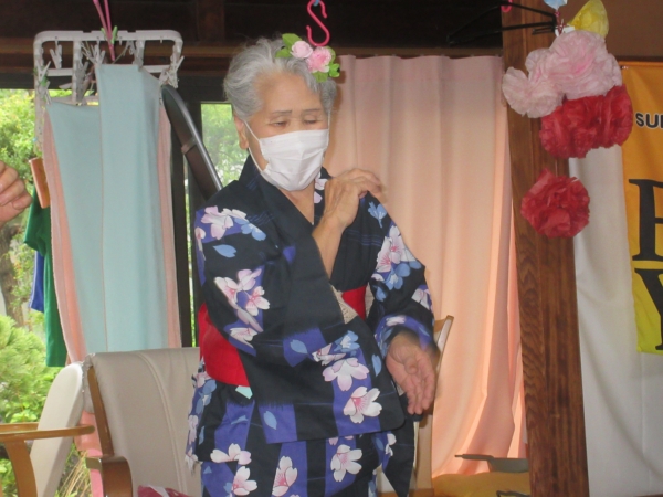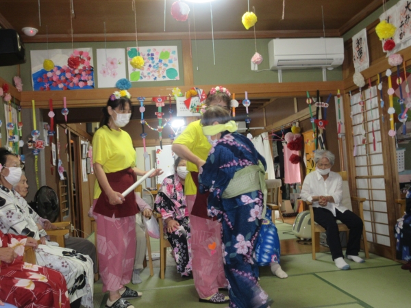 浴衣を着るのに、スタッフも手伝っていきますムード