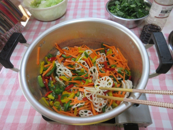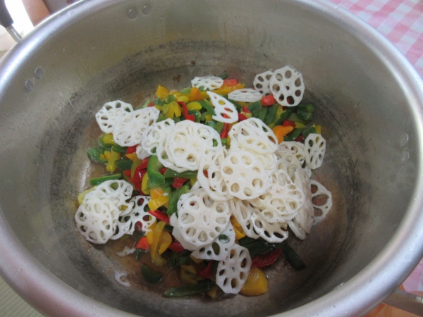 彩り野菜を使い炒めて行きます