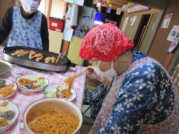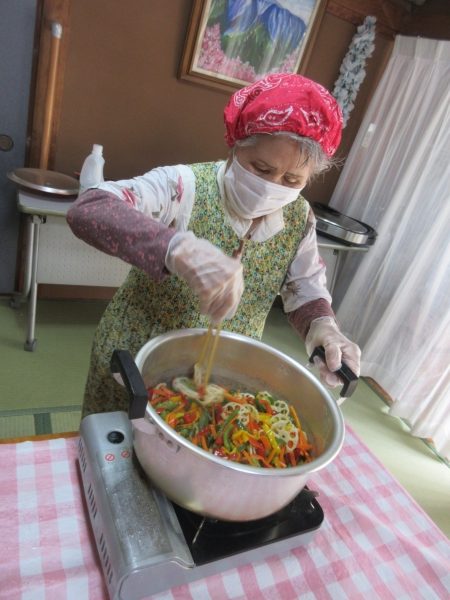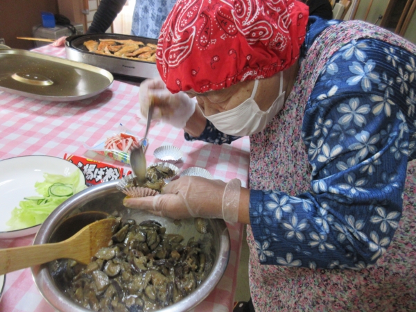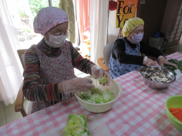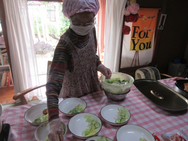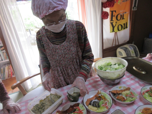 ベテラン母達は手際良く盛り付けています