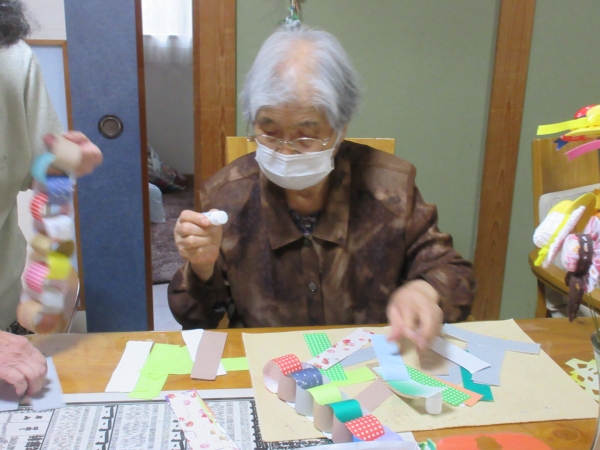色とりどりの折り紙をつないでいきます