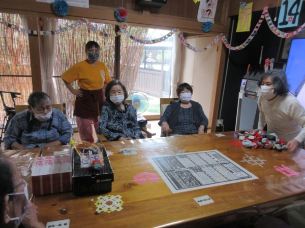 お手玉の後に、お手玉を使って玉入れならずお手玉入れのゲームをしてみました