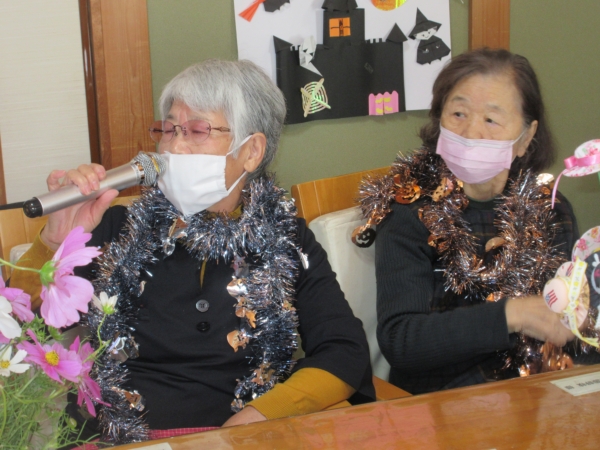 ハロウィンの飾りをまとい、カラオケ