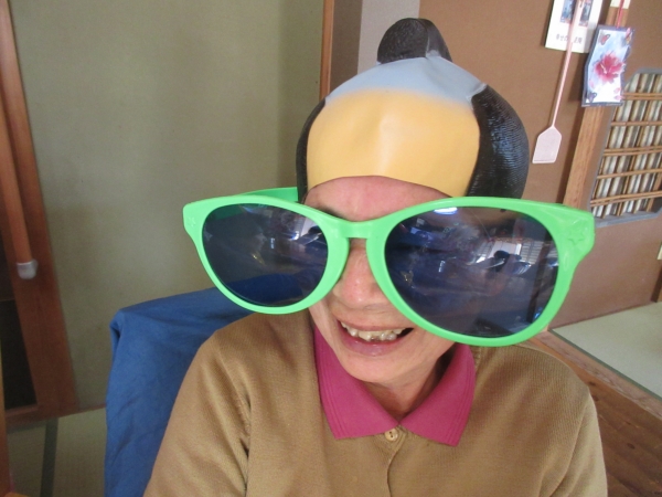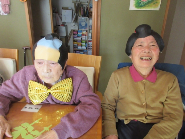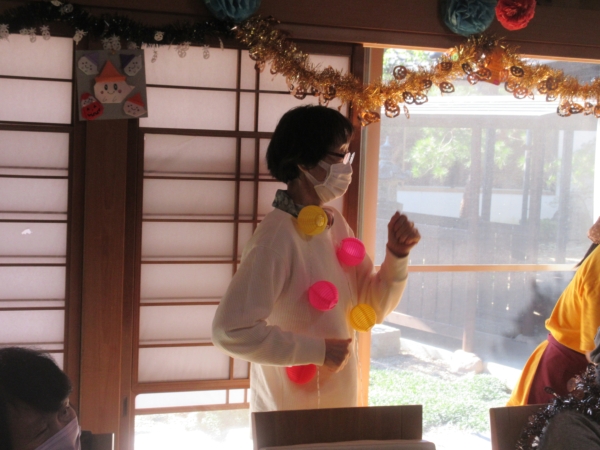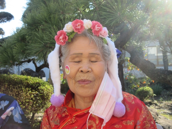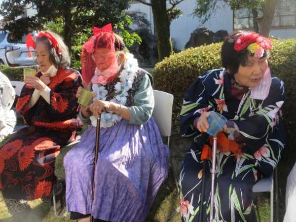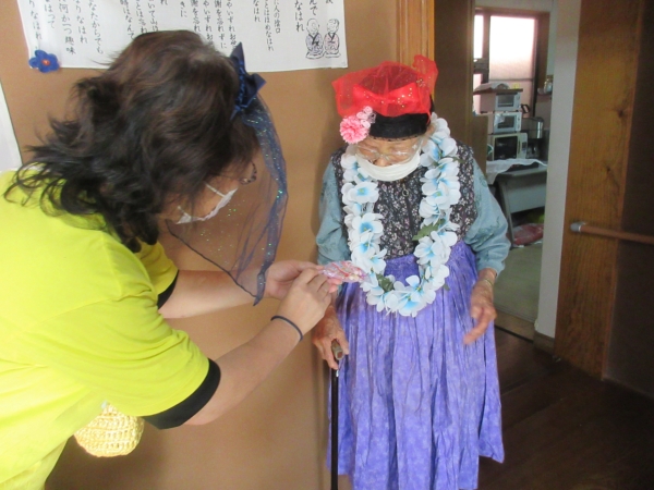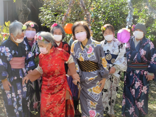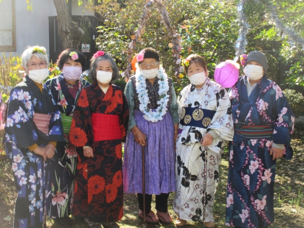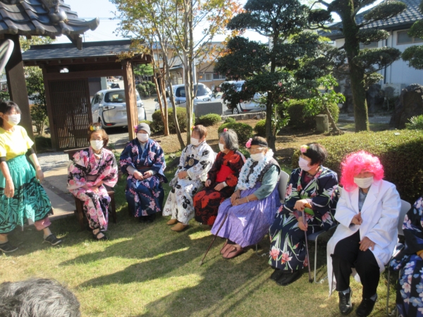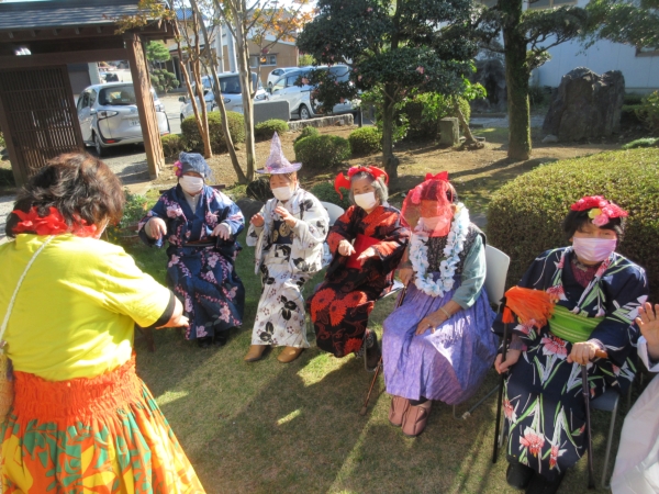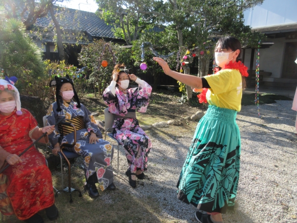 スタッフがフラダンス用の衣装を着て、幸せの幸望庵の母たちと