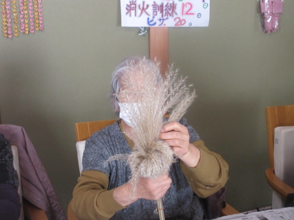 ススキの穂の部分を折り曲げて、フクロウの顔のように丸く
