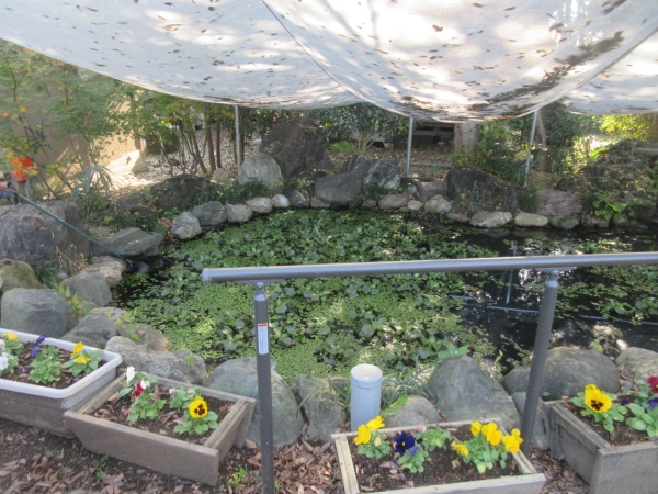 枯れ葉が池に落ちないようにネットが張られている状態になっているのを