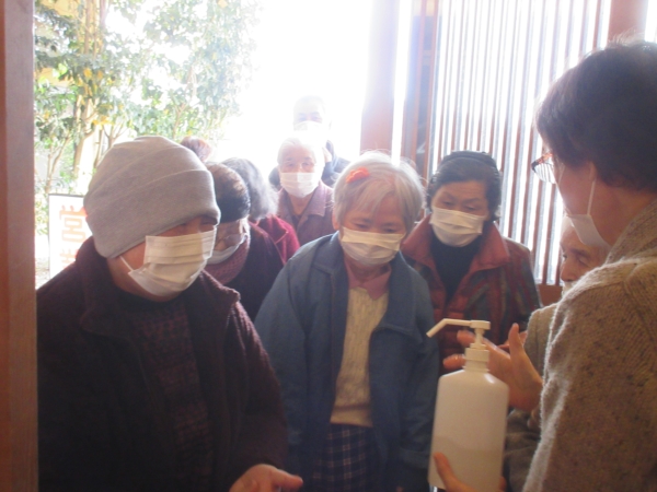 入口部分では、お一人消毒液を持って、全員の消毒を行って