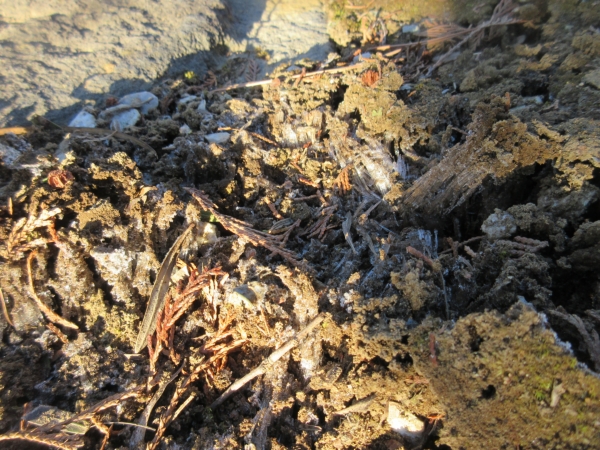 幸せの幸望庵に庭を見ると、霜柱が立っていました