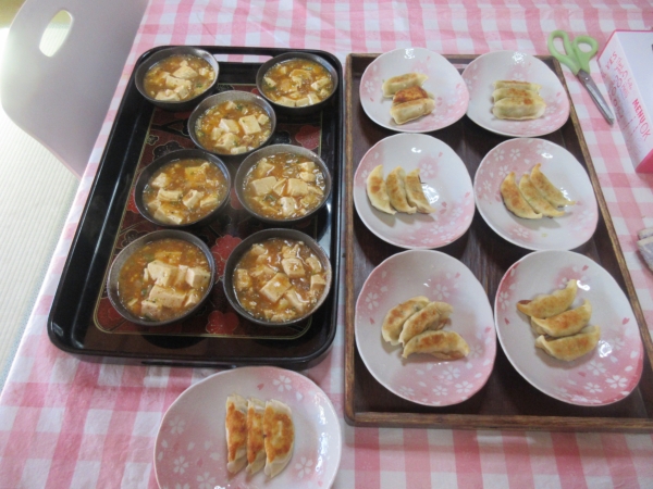 マーボー豆腐と餃子をお皿に盛り付けましたレストラン