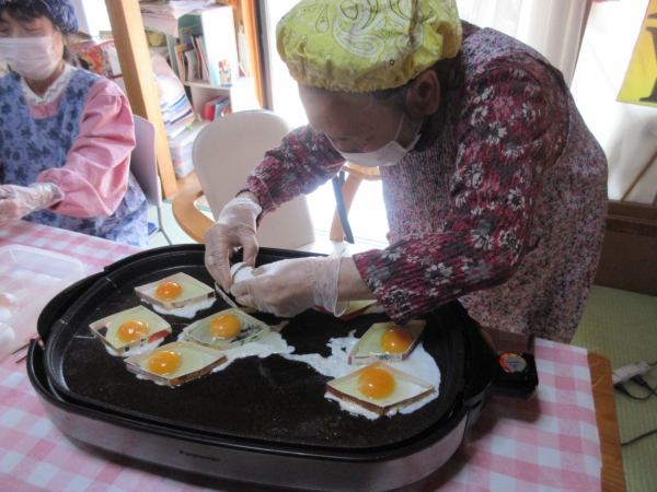 次に、牛乳パックで作った型に卵を割り入れ、目玉焼きを焼いていきます🍳
