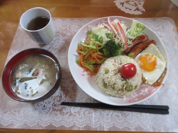 枝豆と竹の子の炊き込みご飯、ウインナー、金平、サラダを盛り付け…