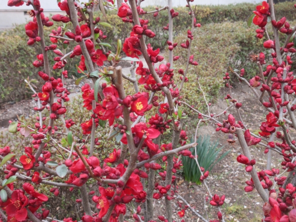 真赤な花を咲かせているのは、ボケの花ですわーい (嬉しい顔)