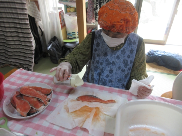 では、メイン料理の鮭に、塩コショウで下味を付けましょう🧂