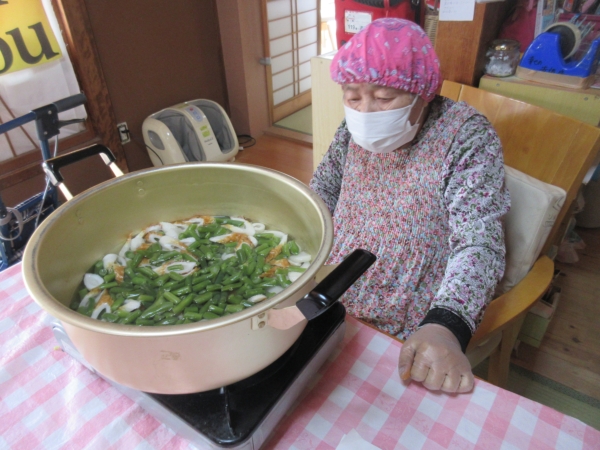カットしたインゲンと竹輪と人参を煮ていきますexclamation