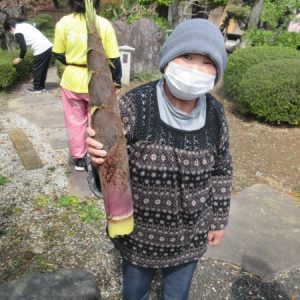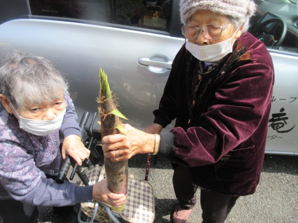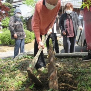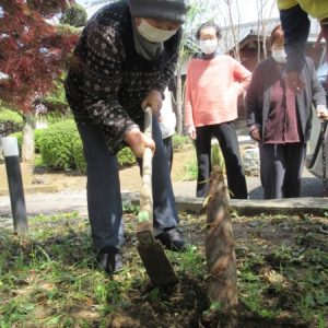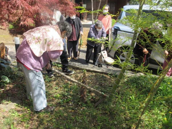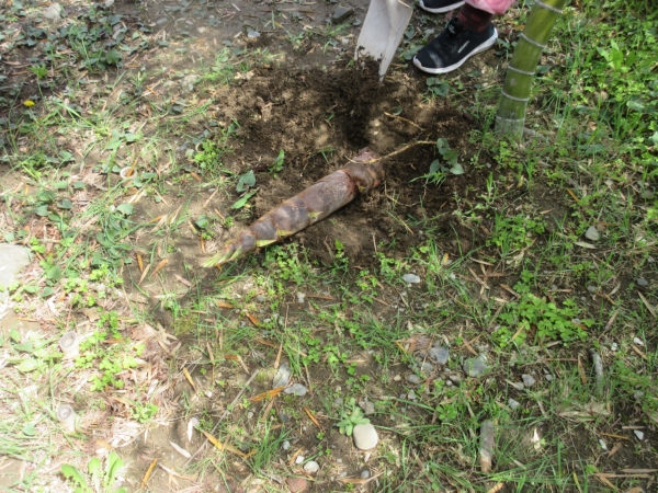 午前は、この幸せの幸望庵の庭で大きくなった竹の子狩りへー (長音記号2)