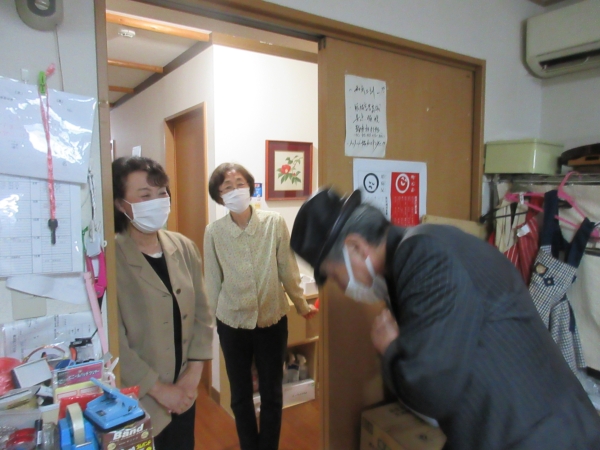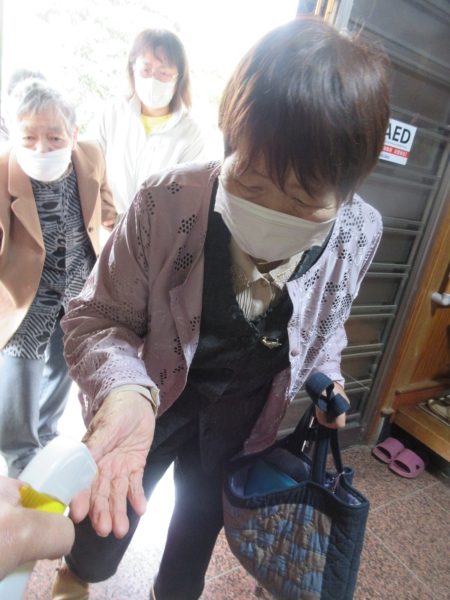 感染症予防の為、皆様には、こうして玄関でのアルコール消毒につき、