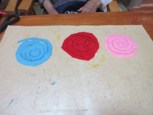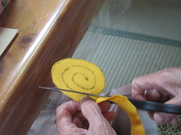 午後は、フェルトを渦巻き状に描いた線に沿って、ハサミを