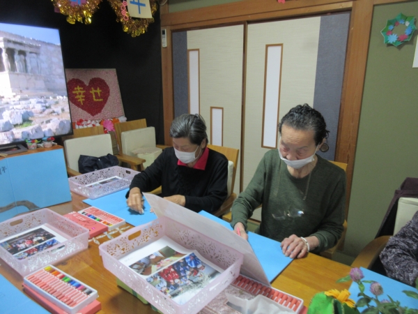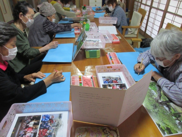 鉛筆で下書きをする母や、そのままクレヨンで描き始める母もいます✍
