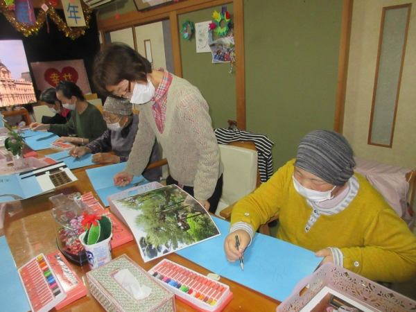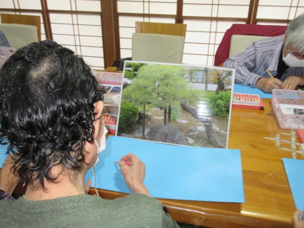 真剣な眼差しで見本の写真を見ながら松をスケッチしていきます
