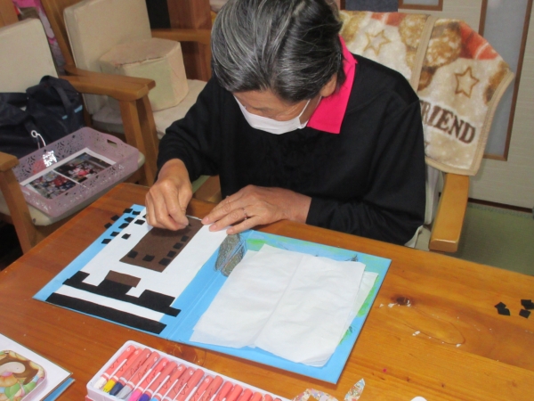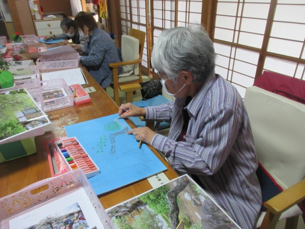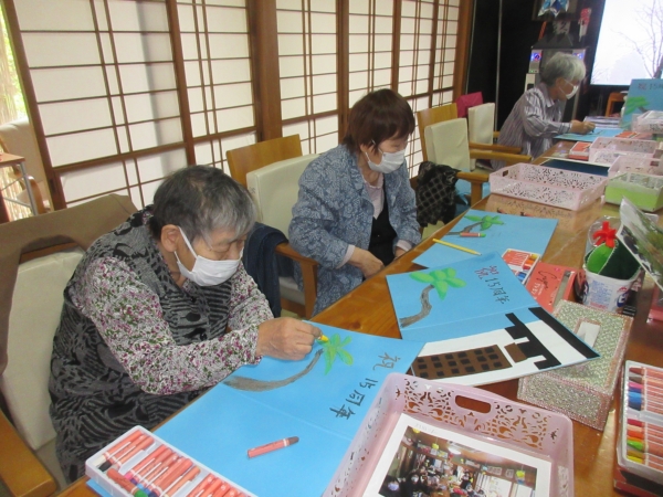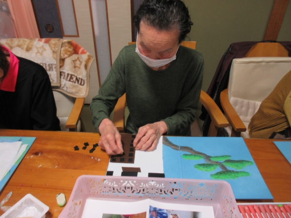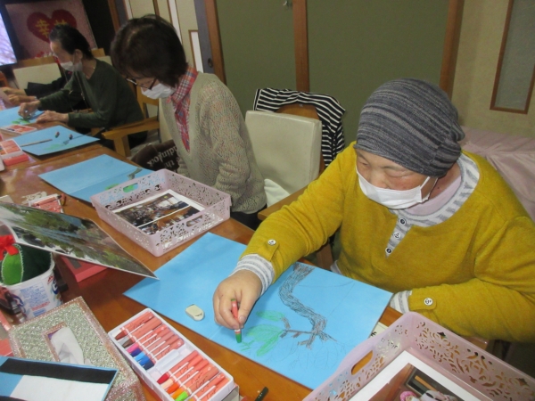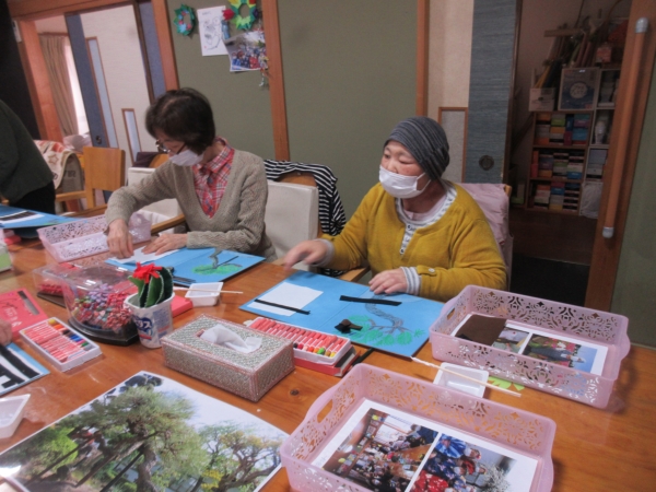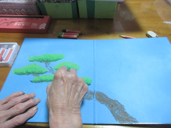 鉛筆での下書きが終わり、松の枝にクレヨンで色がついきました
