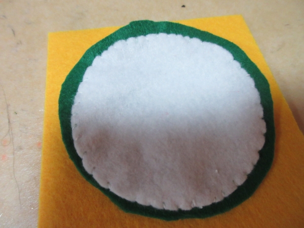 スイカの皮の部分を緑と白のフェルトで丸く切ります