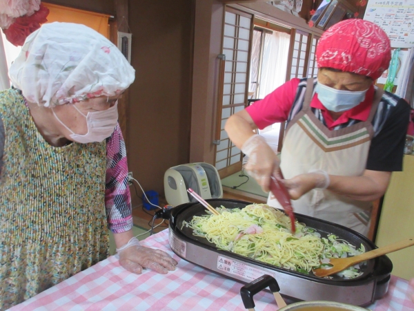 茹で上がった麺と野菜を混ぜ合わせ…