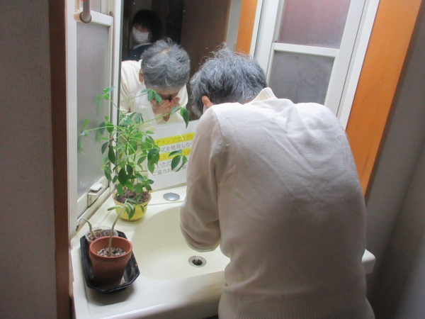 玄関で朝の挨拶された後は、洗面台にて手洗いにうがいをしていただきます