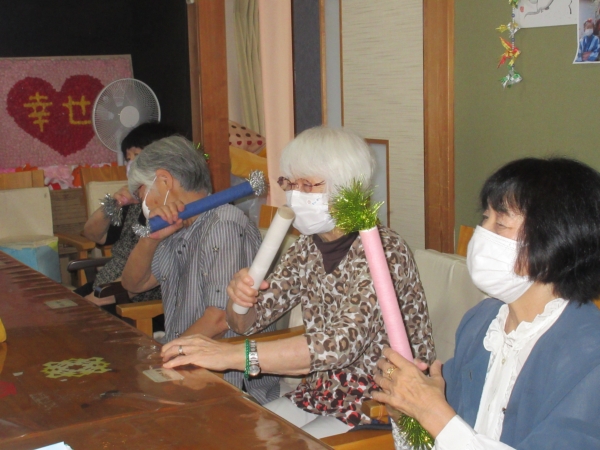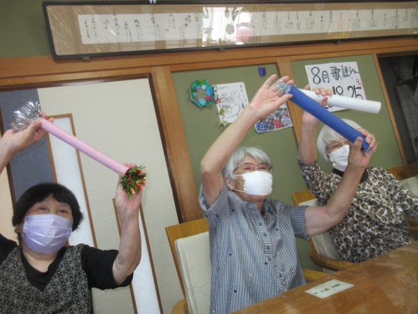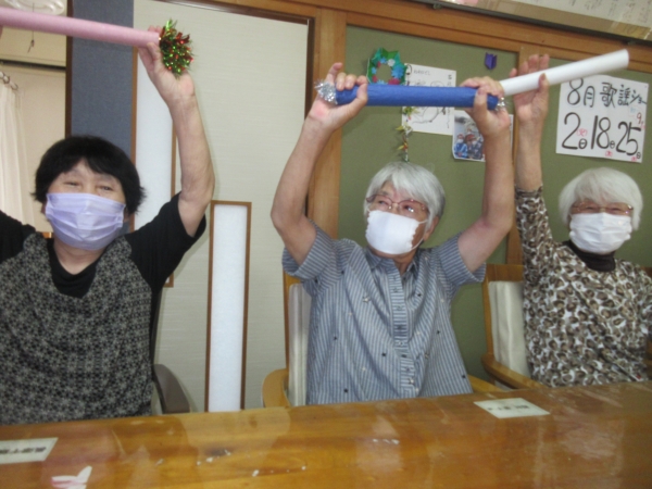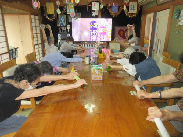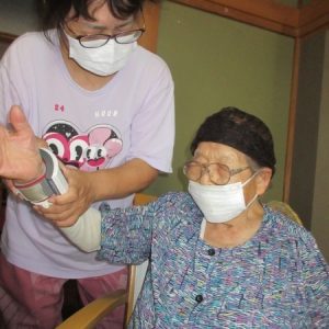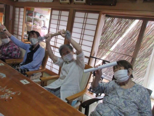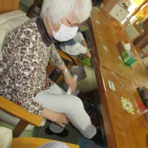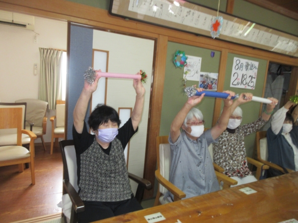 足の体操は、棒を膝の裏に入れて足を上げていきます