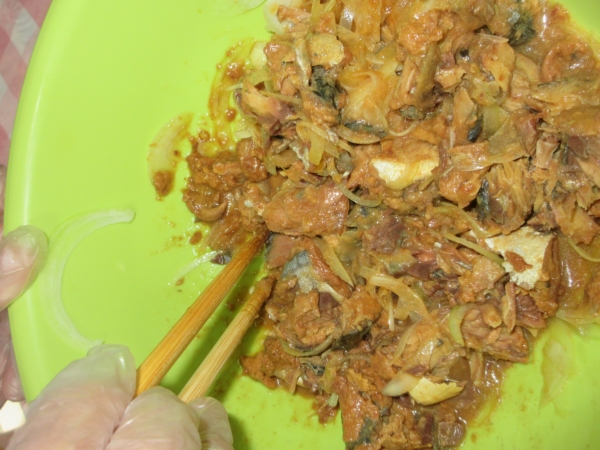 鯖缶と玉ねぎを絡ませてサラダを作ります