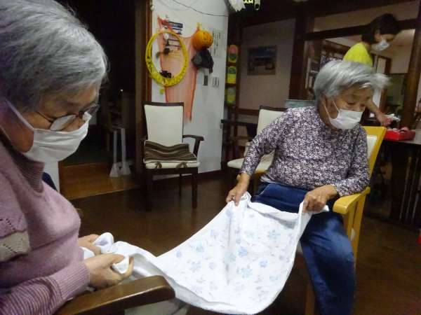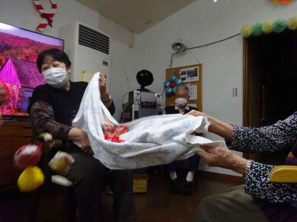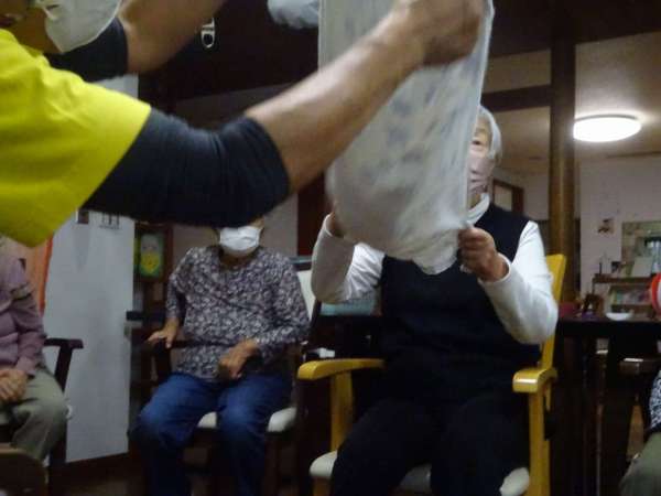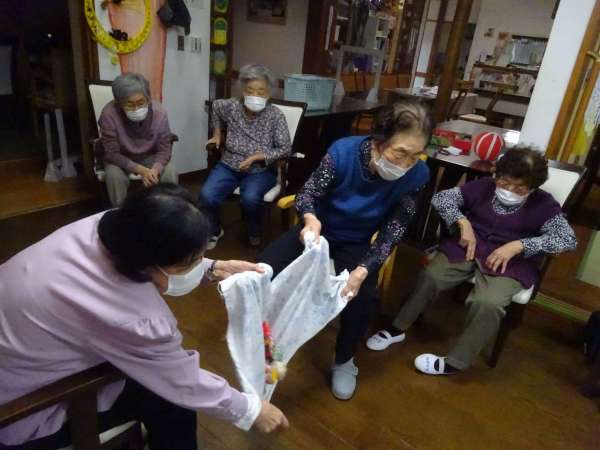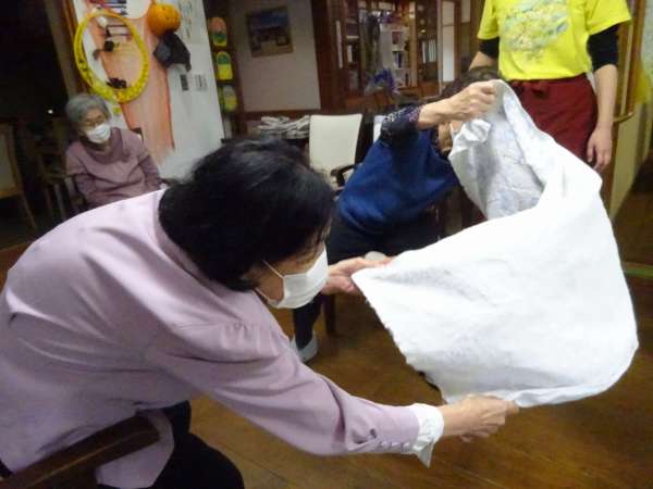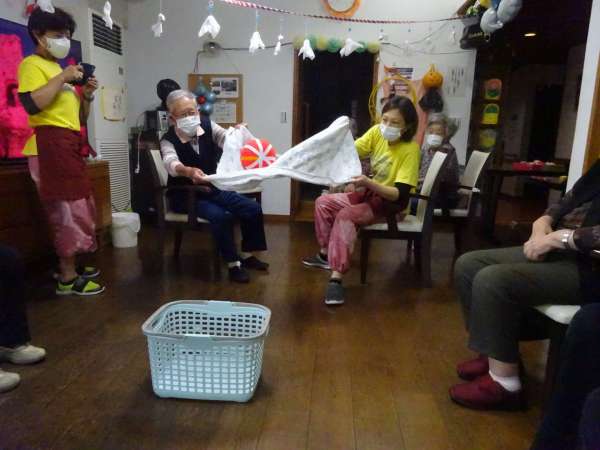 これを二人で持ったバスタオルに乗せて、かごに向かって投げ入れます