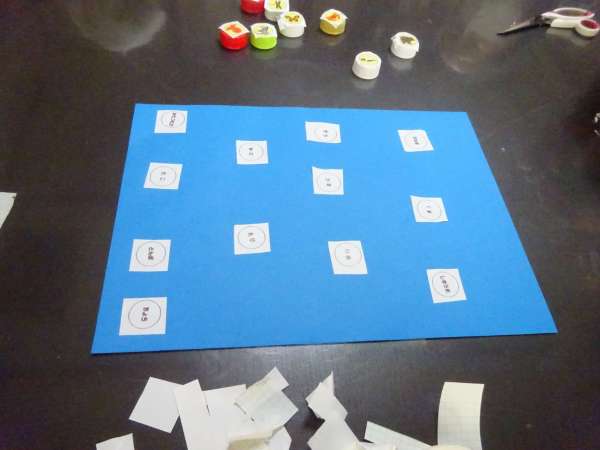 切ったものは、シールになっているので、台紙の画用紙とペットボトルのキャップに貼っていきます。