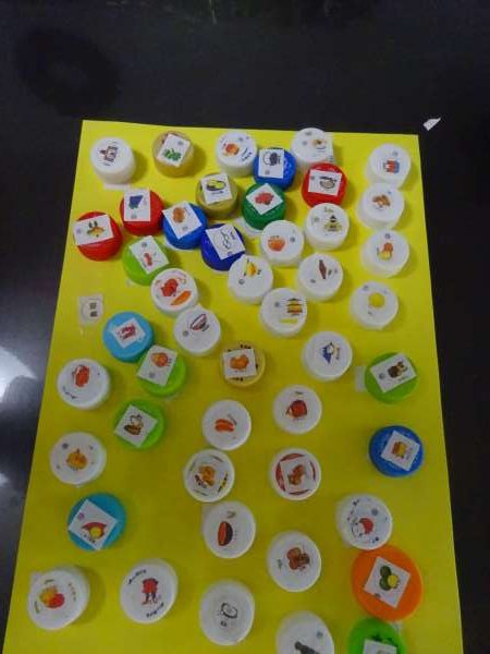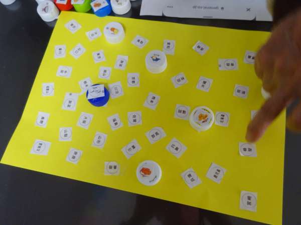 先ほど貼った台紙にイラストを貼ったペットボトルのキャップを合わせて載せていきます。