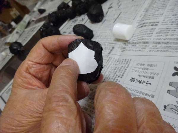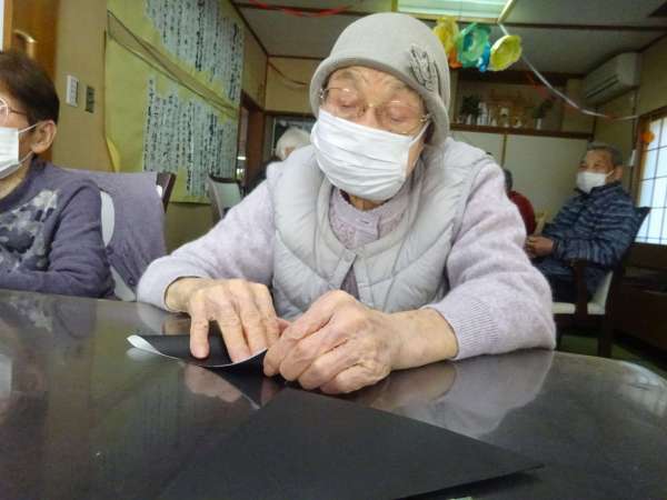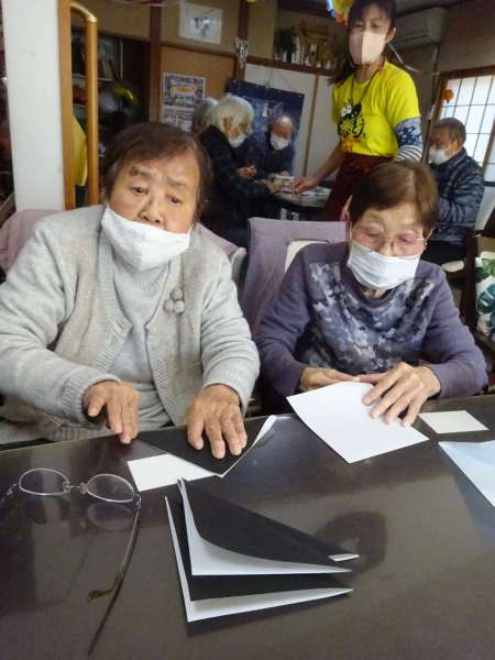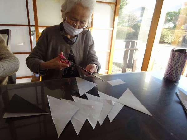 こちらのお母様方は、黒い画用紙を三角に折って・・・・