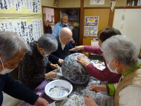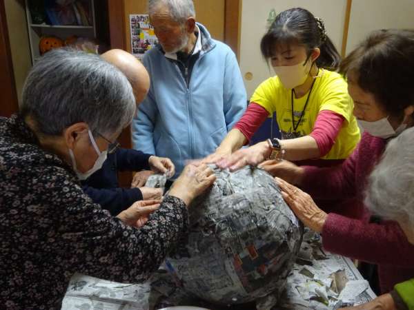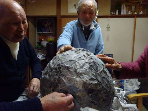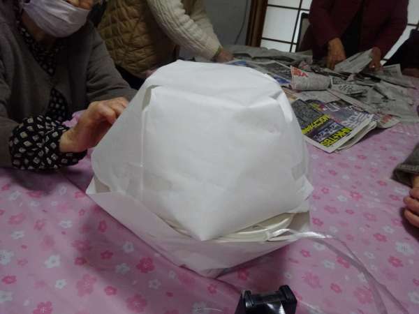 先ほど、白い紙で包んだボールに貼り付けます。
