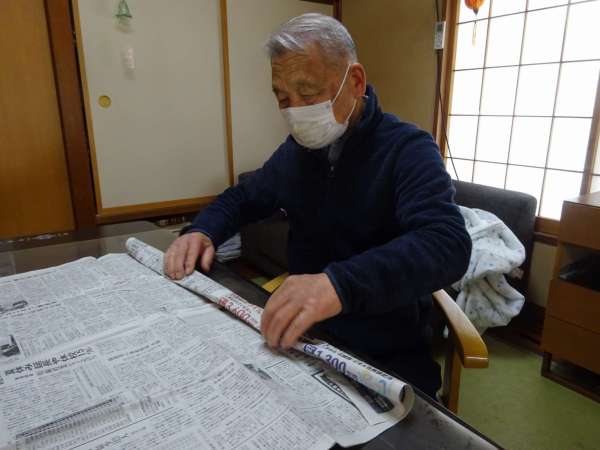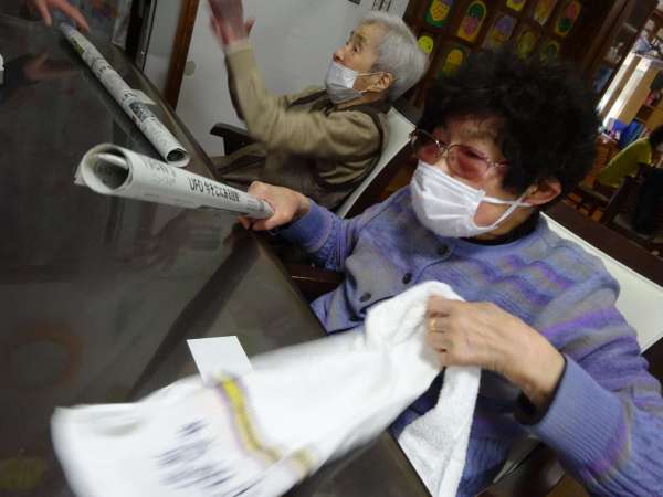 気合が入りすぎて、新聞紙も折れ曲がってしまいます