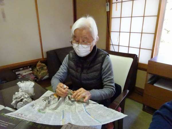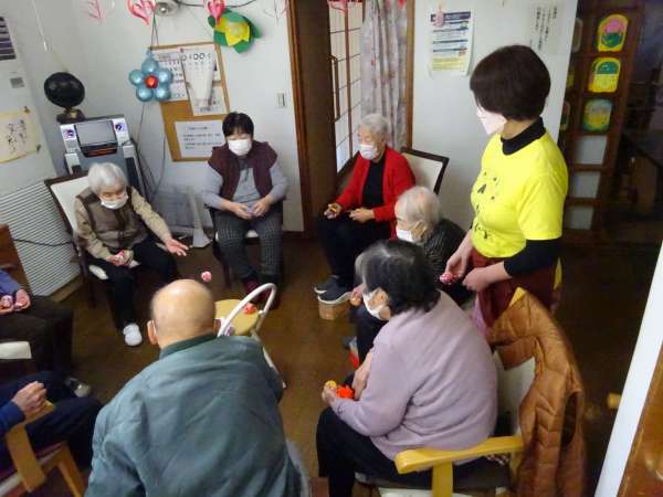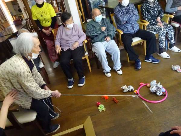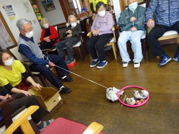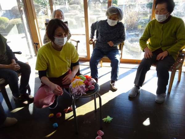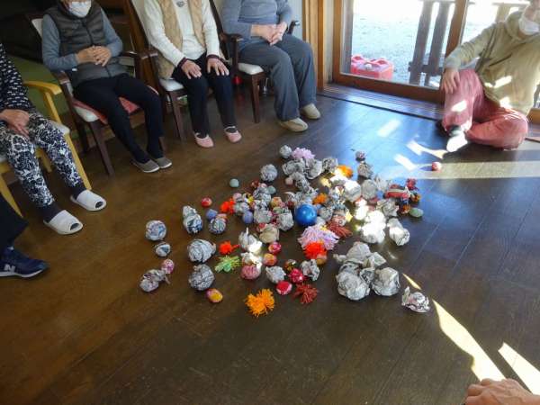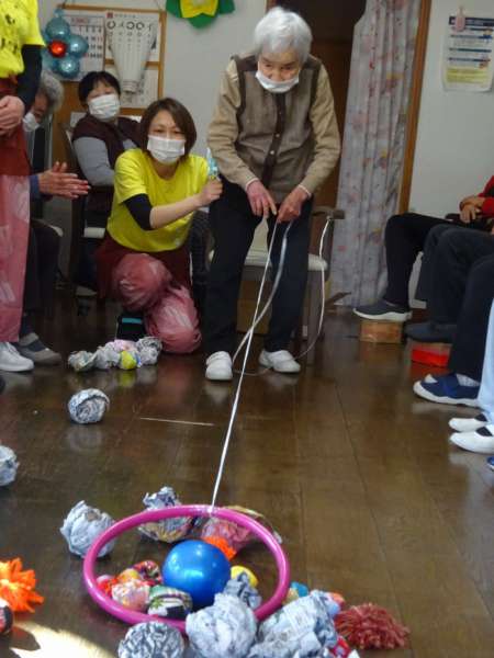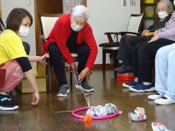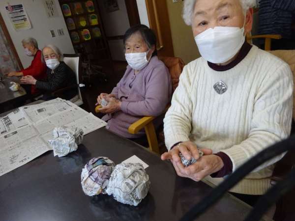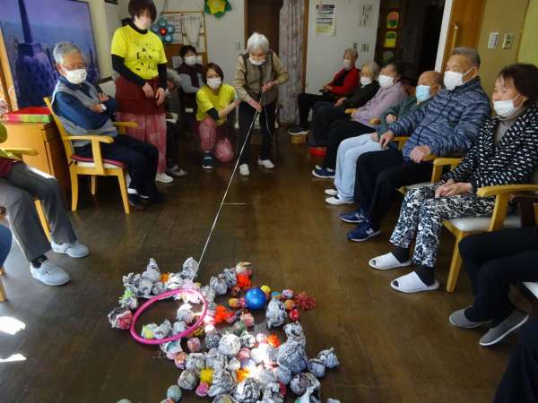 続いて使うのは、先ほど皆様に丸めてもらった新聞紙とお手玉。。。