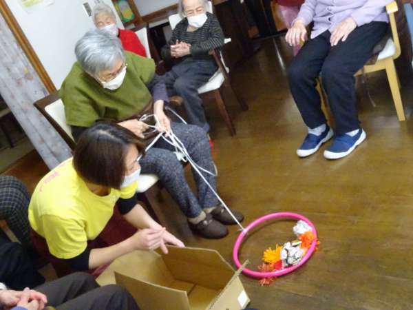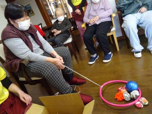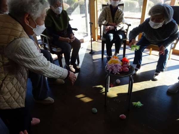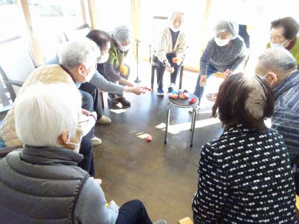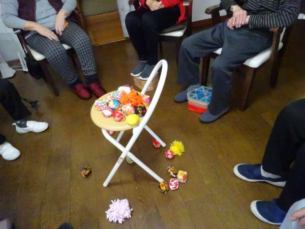お手玉や毛玉を投げて、真ん中の椅子の上に乗った数で競います