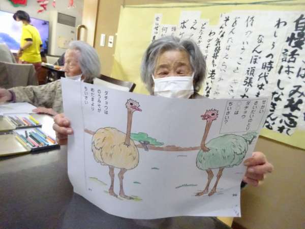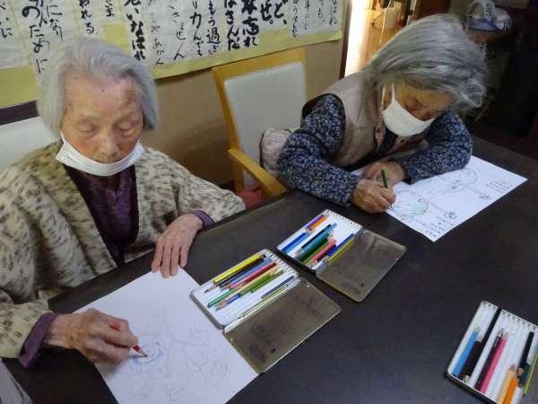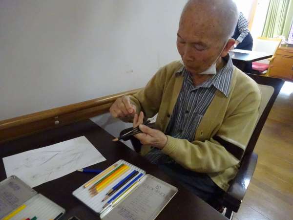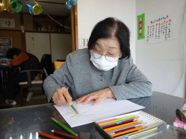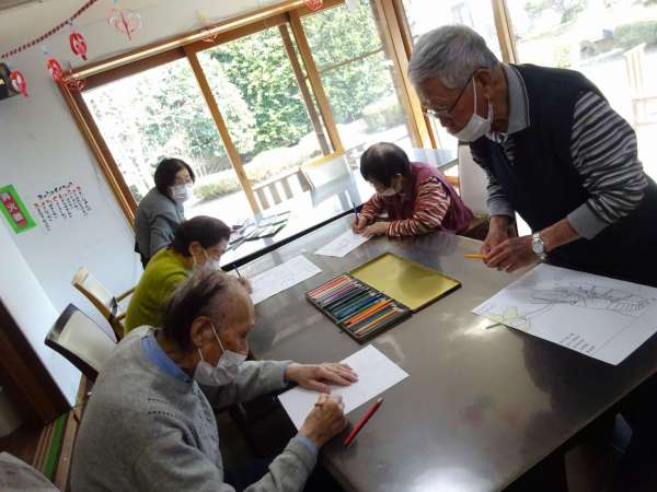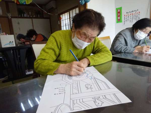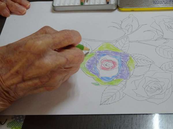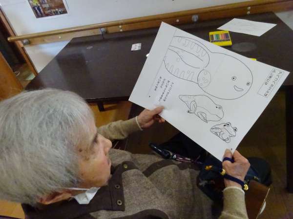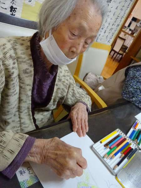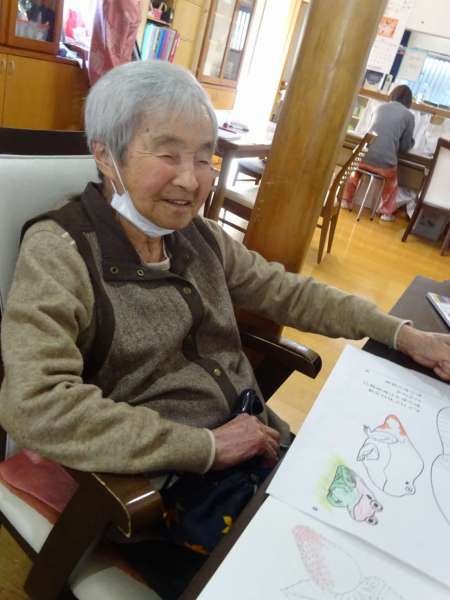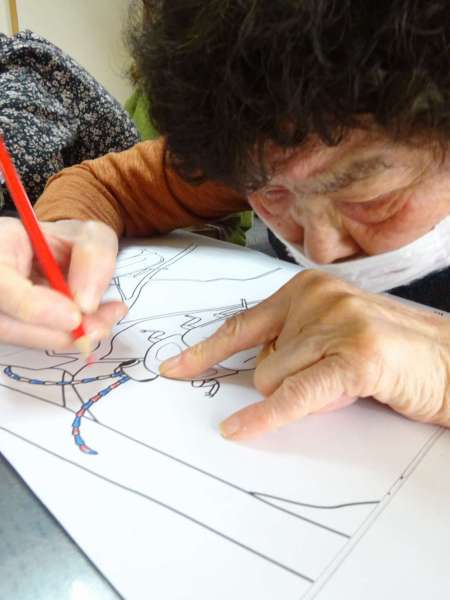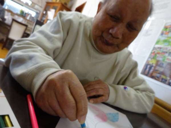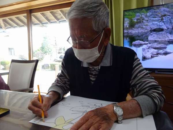スタッフが話しかけても、塗り絵に夢中なお父さん