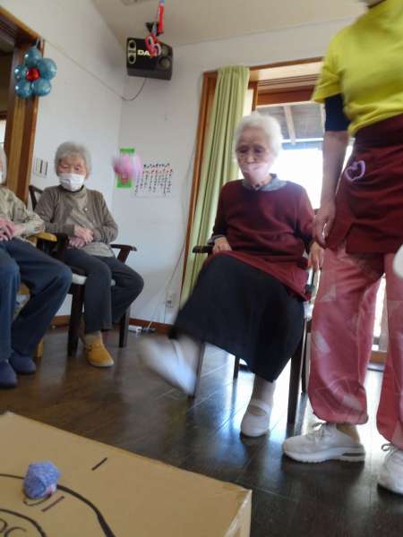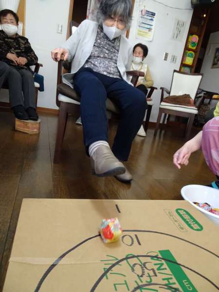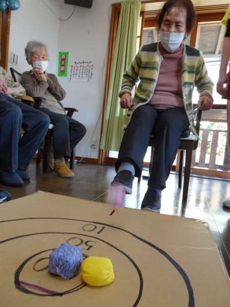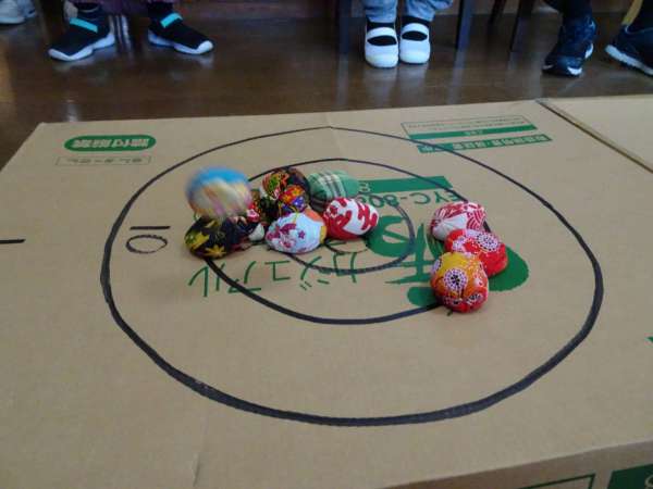 足に乗せたお手玉を、先ほどの的を狙って飛ばします👣