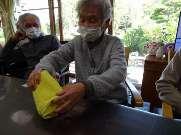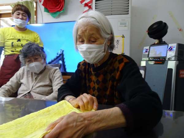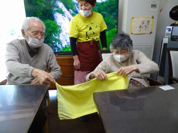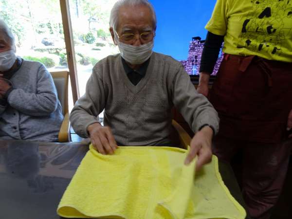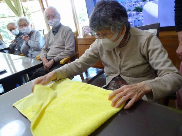 タオルを4回畳んで、開いてお隣の人へ「はい