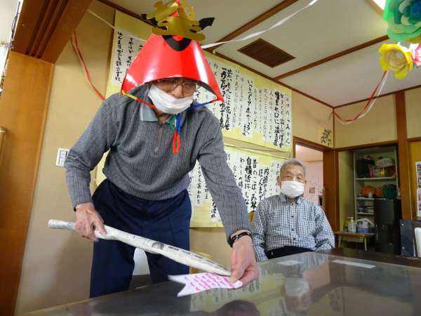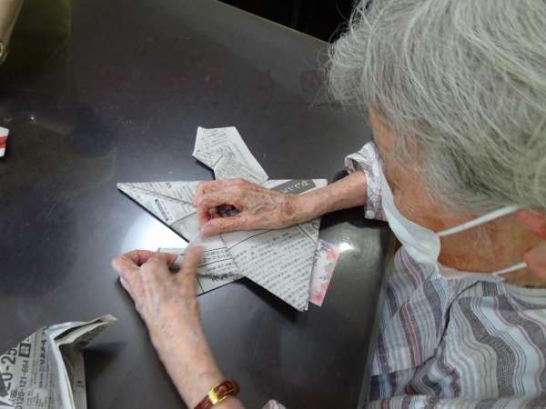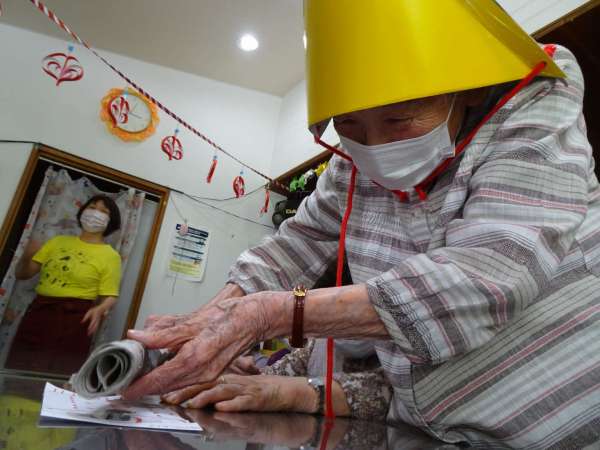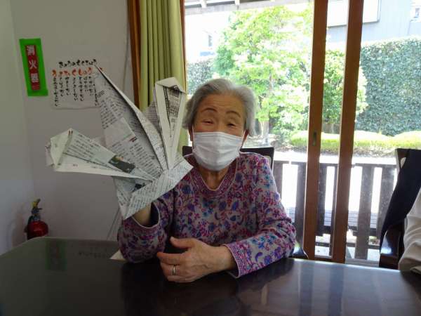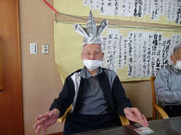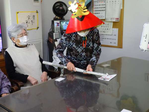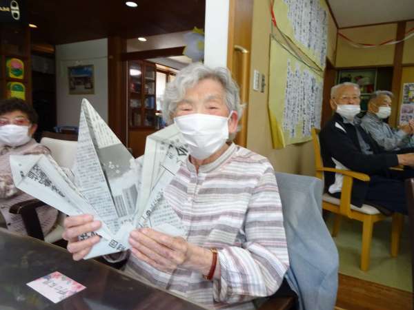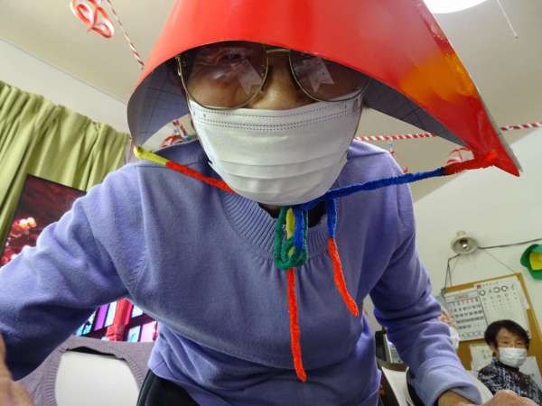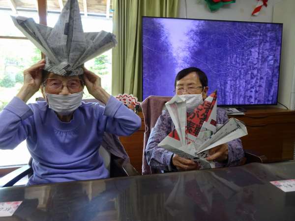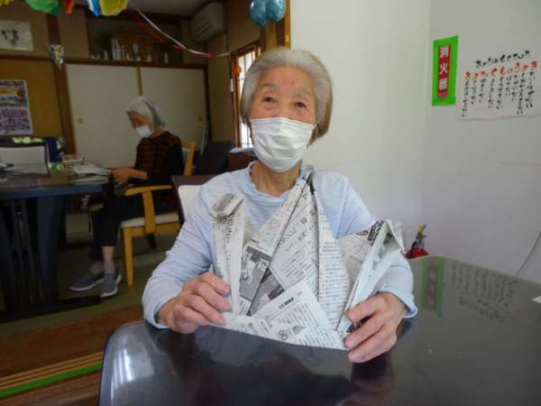 午前中では、新聞紙を使っての「カッコイイ兜」に挑戦
