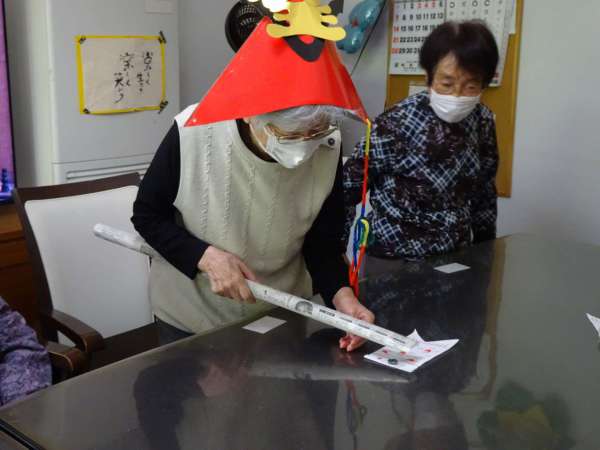 「兜」と新聞紙の棒をバトン代わりに、一致団結して鯉を動かしていきましょう
