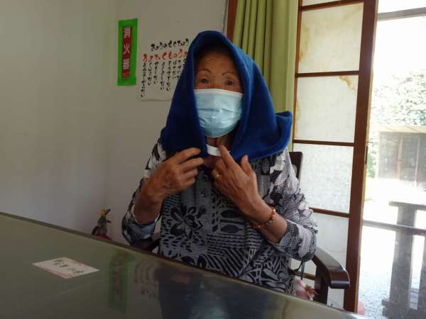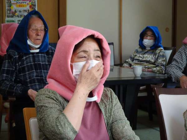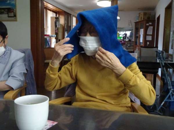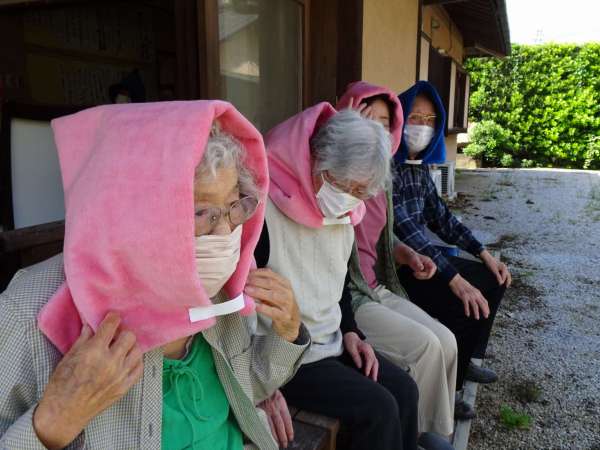 以前皆に様に作って頂いた防空頭巾をしっかりと被り頭を守ります